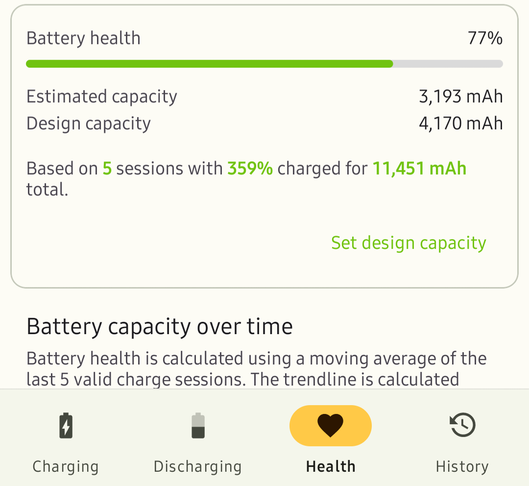 بعد التعرّف على السعة التصميمية للجهاز (المُعلنة من الشركة المصنعة)، يقارن التطبيق بينها وبين السعة التي حسبها فعليًا، ليستنتج نسبة «صحة البطارية» الحالية.